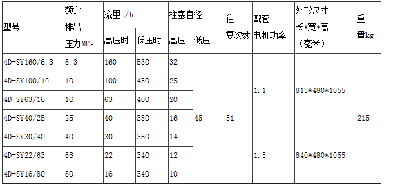 4D-SY型(6.3—80MPa)电动试压泵主要适用于各类压力容器、氧气瓶、管道、阀门、蒸气锅炉等作水压试验,予应力加工新工艺和试验室中获得液体高压源的设备。是原机械工业部通用机械研究所试压泵联合设计组设计的最新系列产品,它具备了旧式产品的 “三化”程度高、使用寿命长、性能稳定、移动灵活、重量轻等特点,并在此基础上增加了传动装置和十字转换,使本系列产品的综合技术指标全面达到标准要求,各种性能更加稳定可靠,使用更加安全方便,同时达到了节能省电的效果。在产品结构方面选用了封闭式水箱,降低了整机高度,使外形更加紧凑美观。该产品系按 5°—60℃的清水,乳化液和粘度不大于45mm2/s的油品为工作介质而特意设计的,在试压的初始阶段能迅速充液和升压,以缩短试验时间,具有较大的流量,当压力超过1.6Mpa(此压力可以调低)后,为使试压过程更加平稳的进行,则流量自动减小。所以该产品在高、低压时具有两种流量,并能自动变换。凡在额定排出压力以下,可进行任意数值的压力试验,该产品的工作环境温度:5°—60℃。
