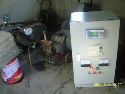压力遥控自控系统使用方法:该泵在使用前,只需在电接点压力表上设定上限压力值,在数显时间继电器上设置好保压时间,然后按遥控或手动按钮启动试压泵,当压力达到事先设定的上限目标值时,试压泵会自动停机进入保压状态,这时可通过数显压力表及试压泵上机械压力表观察实时压力状态(也可通过数显记录仪显示实时压力曲线和打印试压报表,选择性功能不在报价之内)当保压时间到泄压阀会自动打开卸除压力,也可手动打开试压泵上的泄压阀卸除压力,试压完毕。
